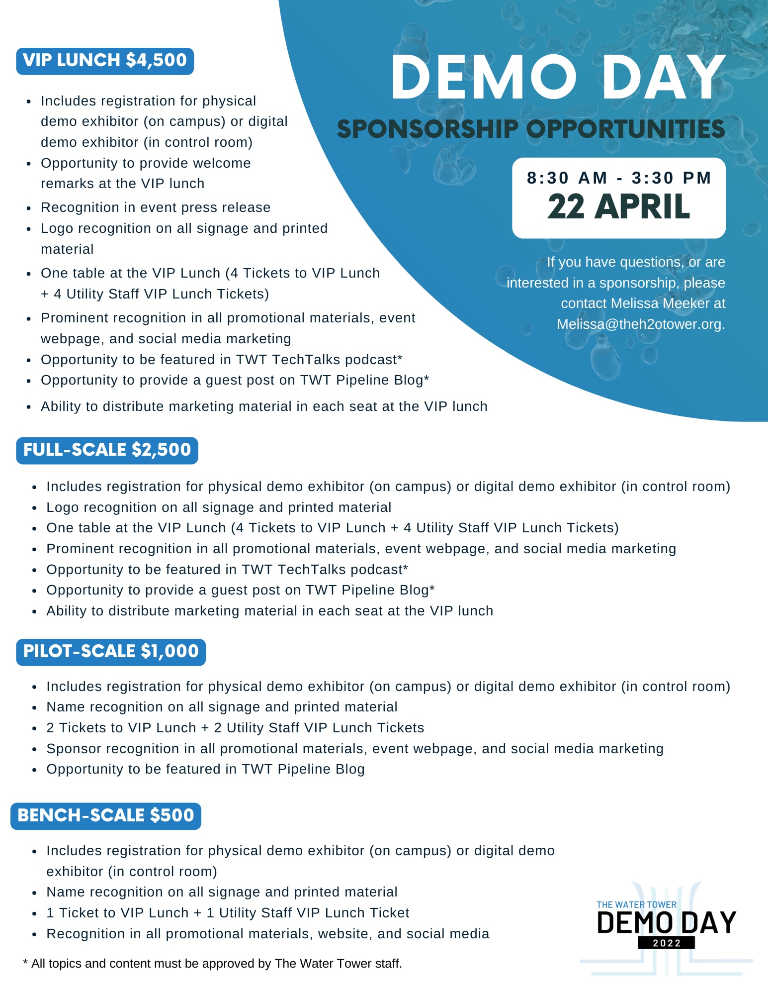 Demo Day 2022 marks The Water Tower’s inaugural event. Water technology companies and manufacturers, consulting and engineering firms, and water utilities are invited to spend the day experiencing the industry’s latest technologies, in the field and in the control room, and hearing from industry thought leaders on cutting edge topics, all while networking with your public, private and nonprofit peers.