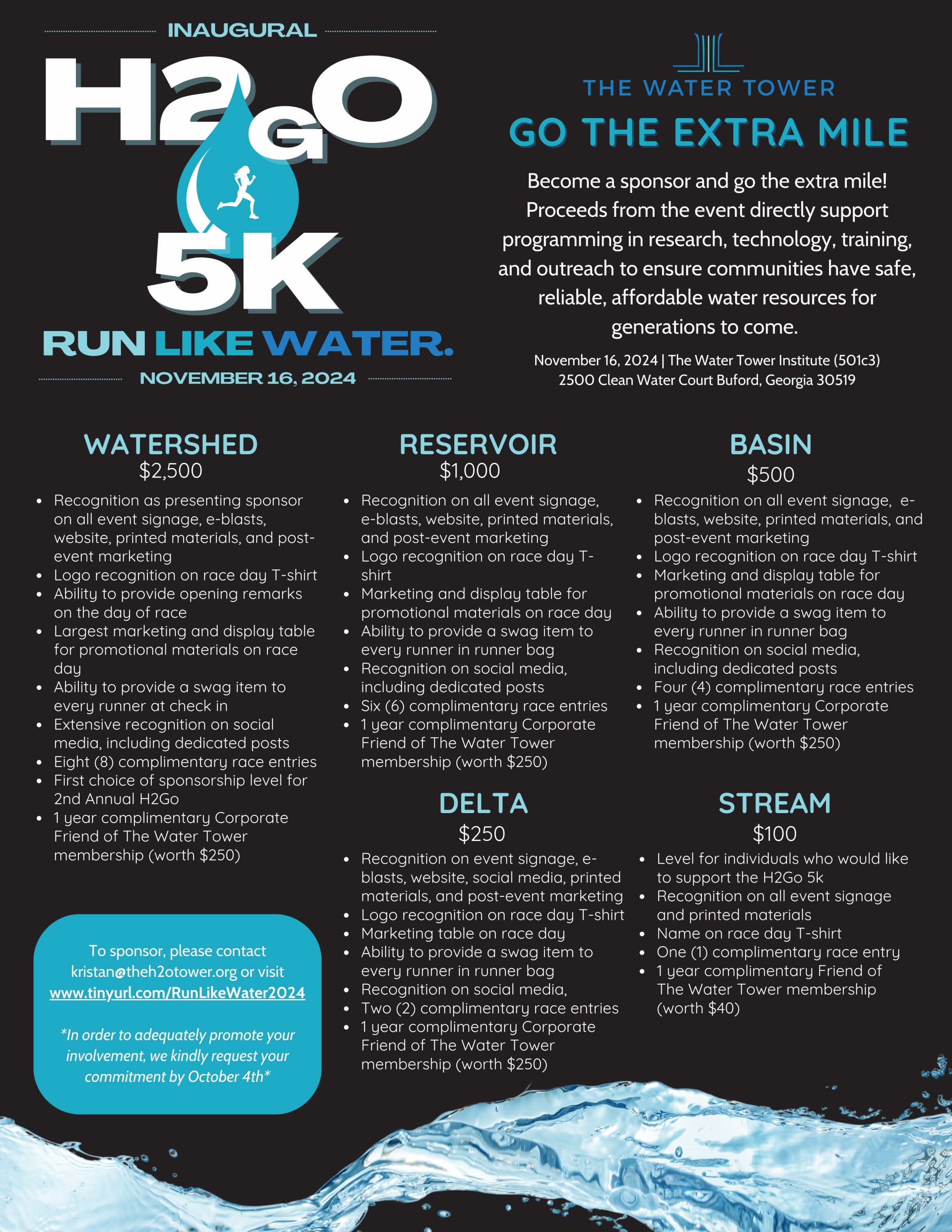 The inaugural H2GO Run Like Water 5k will be held on Saturday, November 16th at The Water Tower!