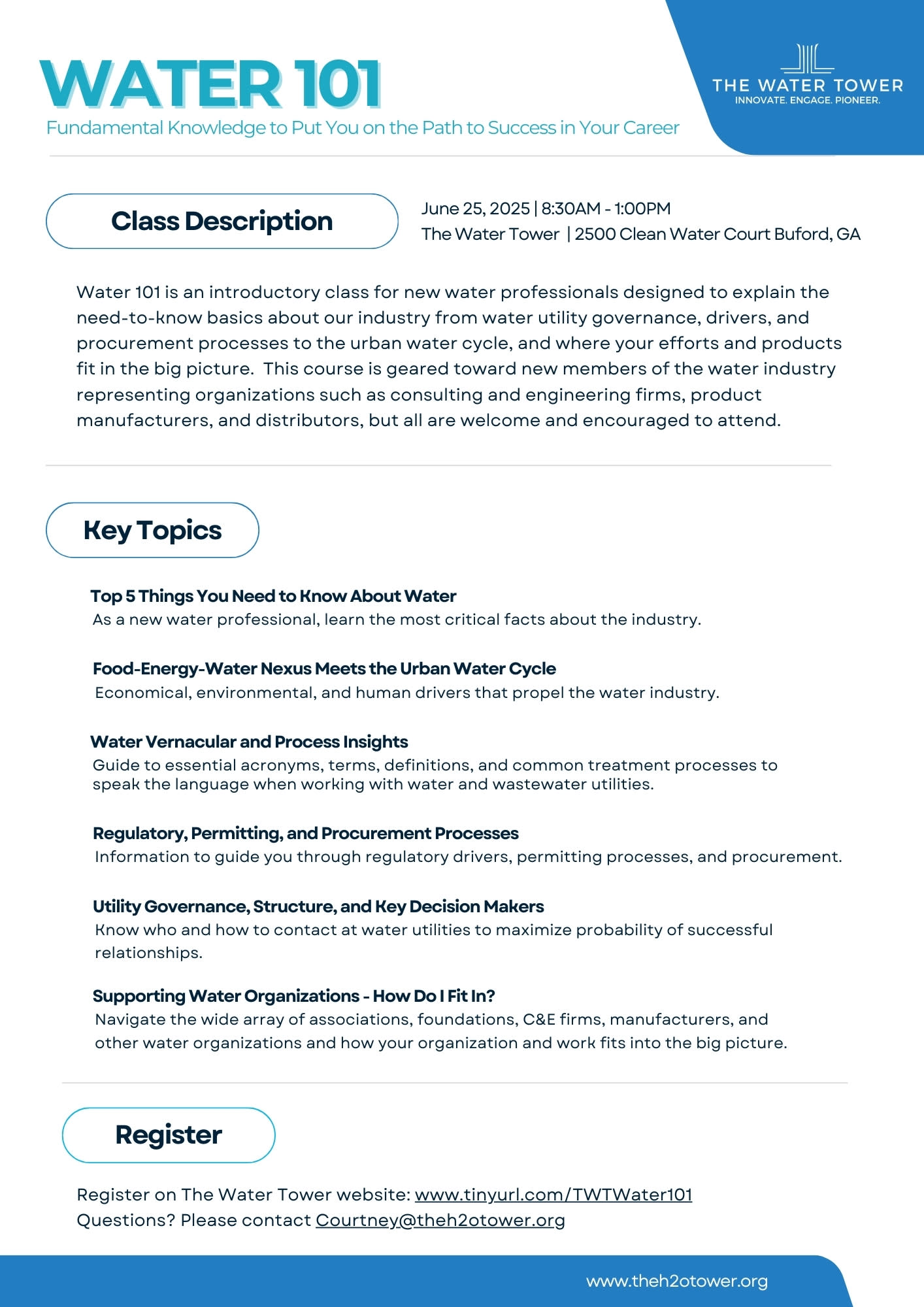 New to the water industry? This is the class for you! Gain fundamental industry knowledge to put you on the path to success in your career. Water 101 is an introductory class designed to explain the need-to-know basics about our industry from water utility governance, drivers, and procurement processes to the urban water cycle, and where your efforts and products fit in the big picture. This course is geared toward new members of the water industry representing organizations such as consulting and engineering firms, product manufacturers, and distributors, but all are welcome and encouraged to attend. Key Topics Top 5 Things You Need to Know About Water. As a new water professional, learn the most critical facts about the industry. Food-Energy-Water Nexus Meets the Urban Water Cycle. Economical, environmental, and human drivers that propel the water industry. Water Vernacular and Process Insights. Guide to essential acronyms, terms, definitions, and common treatment processes to speak the language when working with water and wastewater utilities. Regulatory, Permitting, and Procurement Processes. Information to guide you through regulatory drivers, permitting processes, and procurement. Utility Governance, Structure, and Key Decision Makers. Know who and how to contact at water utilities to maximize probability of successful professional relationships. Supporting Water Organizations - How Do I Fit In? Navigate the wide array of associations, foundations, C&E firms, manufacturers, and other water organizations and how your organization and work fits into the big picture. Plus, in-person attendees will go on tours of The Water Tower Global Innovation Hub and the F. Wayne Hill Water Resources Center. In Person and Virtual Registration Options Registration (in-person): $79 per attendee, includes lunch and tours of The Water Tower Registration (virtual): $59 per attendee, does not include lunch or tours. Logistics Doors will open at 8:00 and class will be from 8:30am – 1:00pm at The Water Tower (2500 Clean Water Court Buford, Georgia 30519). In-person attendees must wear closed toe, flat bottom shoes in order to attend the FWH WRC Tour (PPE will be provided). Virtual registrants will receive a link two days before the event.Images